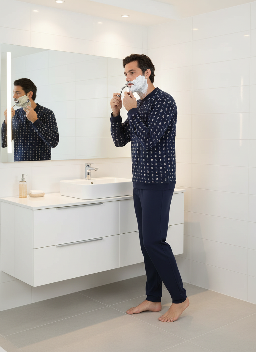 Questo pigiama da uomo Alpina, realizzato in interlock di puro cotone, offre una sensazione naturale, morbida e calda, perfetta per le stagioni fredde.