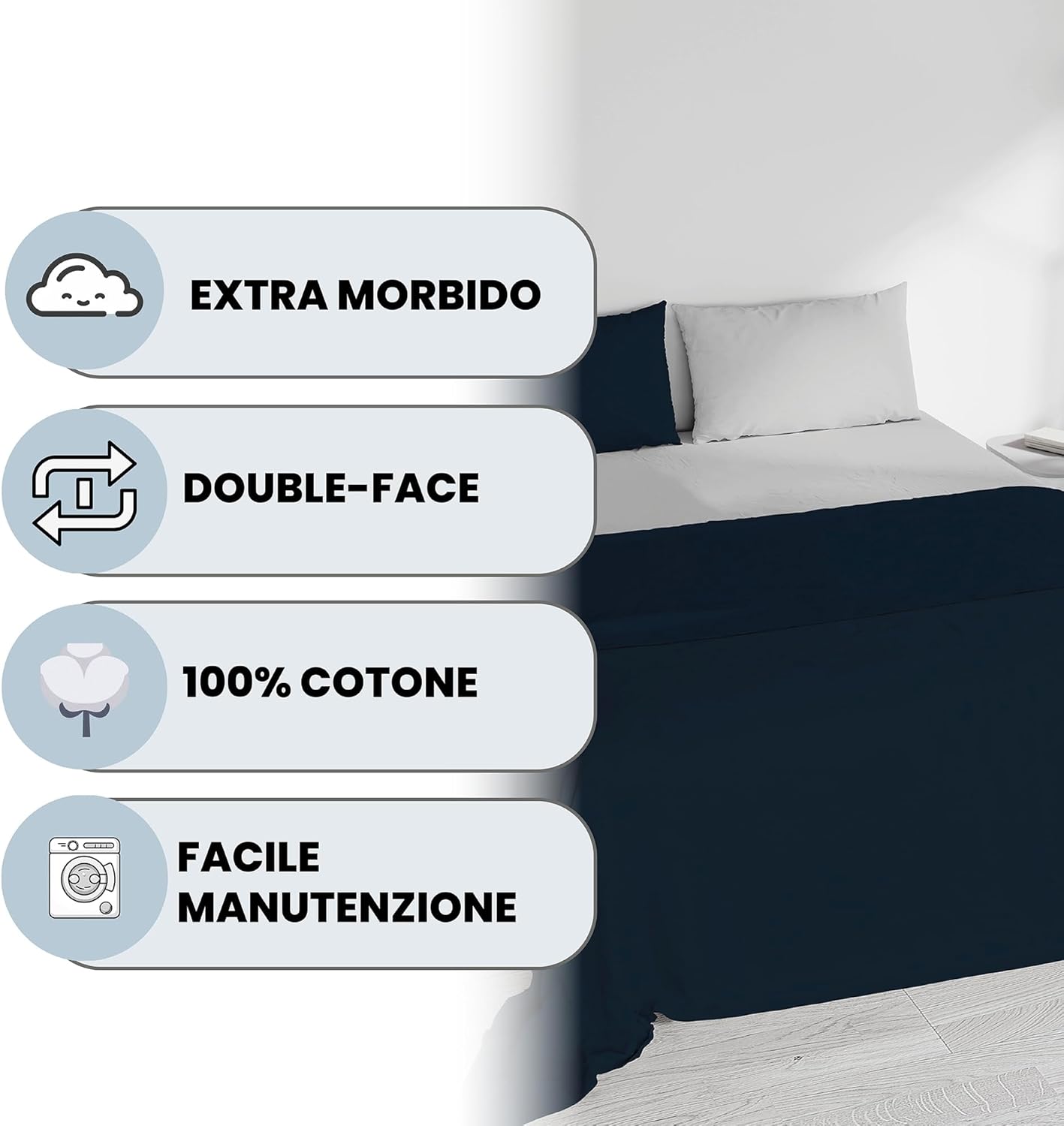 La confezione contiene un completo lenzuola della misura acquistata composto da: 1 lenzuolo sopra 1 lenzuolo sotto con angoli