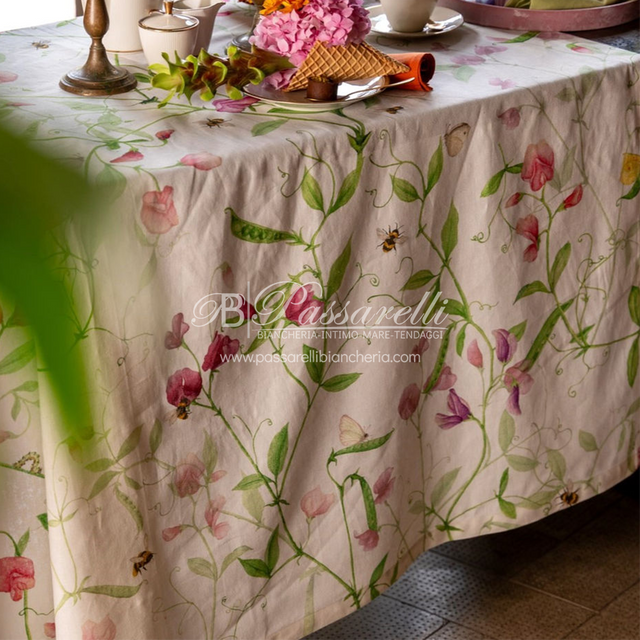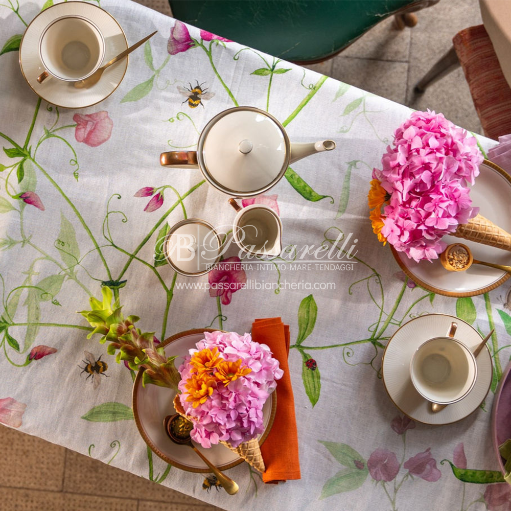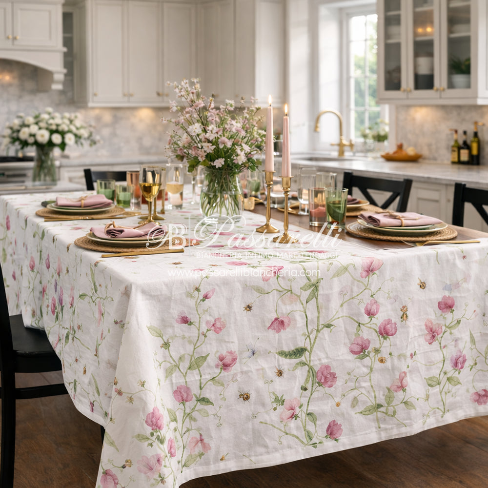 Scopri la magia della Provenza sulla tua tavola con la tovaglia floreale PETIT POIS. Realizzata in un pregiato mix di lino e cotone, cattura l'essenza della primavera con delicate sfumature rosa su fondo crema.
