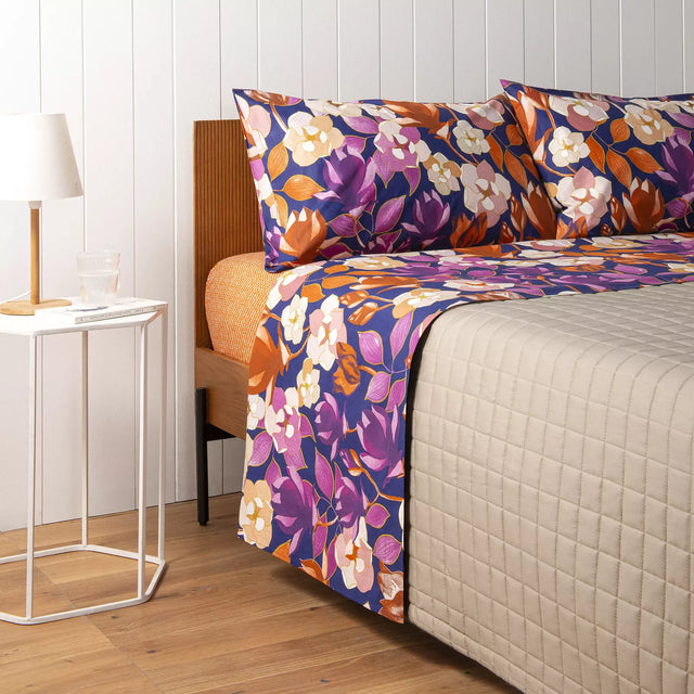 Completo Lenzuola Matrimoniale Garden Flowers di Bassetti in puro cotone, decorato con magnolie e camelie.