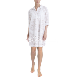 Le maniche 3/4 offrono ulteriore protezione dal sole, mentre il tessuto di sangallo bianco conferisce un look raffinato.