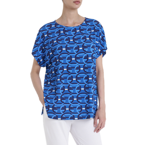Con l'acquisto di questo prodotto riceverai: Una Maglietta girocollo in morbida viscosa stampata “optical” con maniche corte e spacchetti laterali.