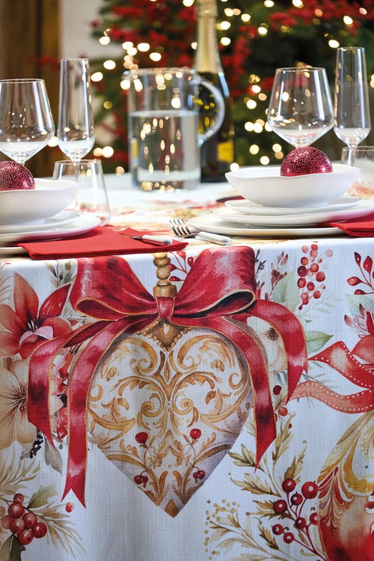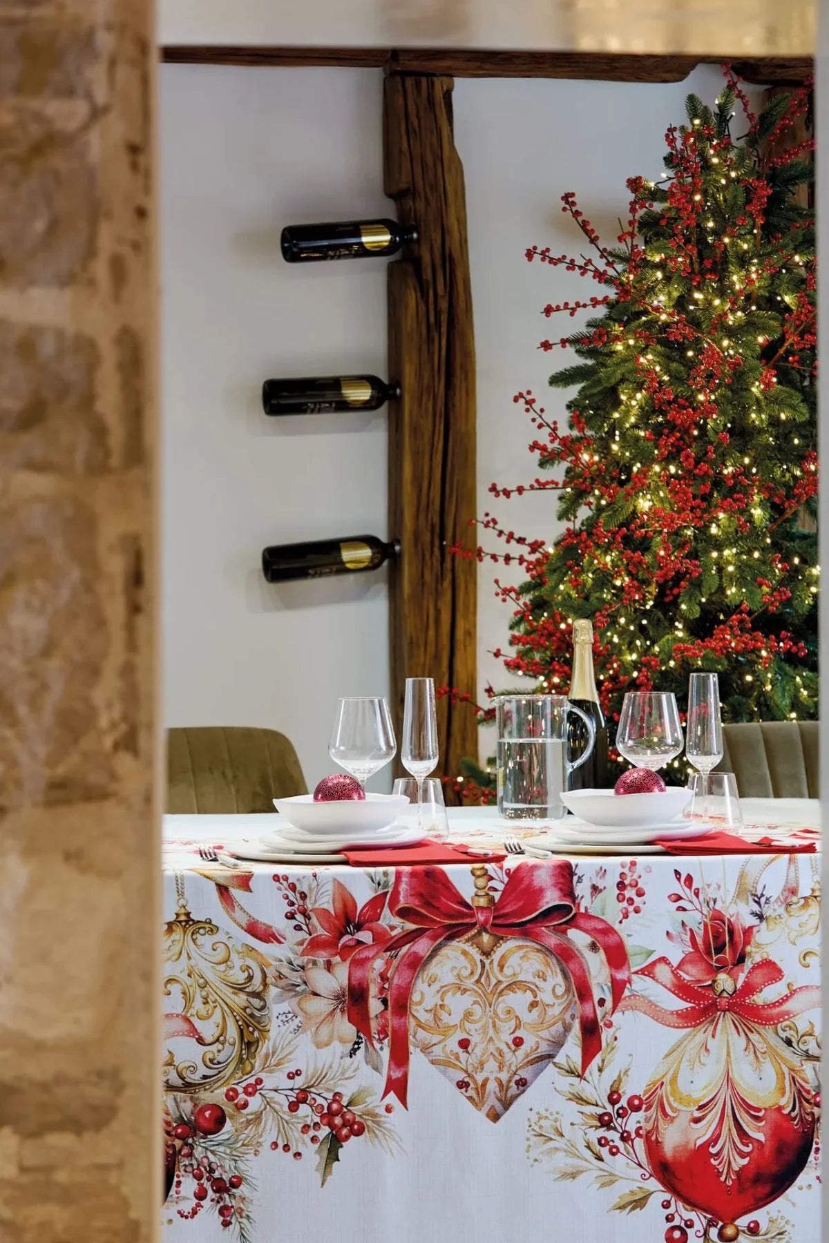 La tovaglia "Preziosi" di Maison Sucrée trasforma la tavola in un'atmosfera natalizia incantevole e sofisticata.