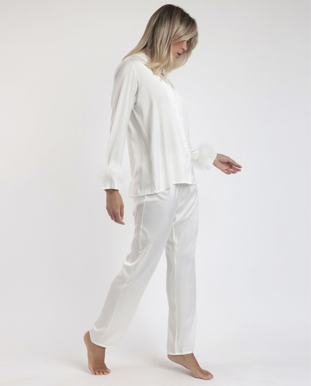 Pigiama aperto, realizzato in tessuto di raso, con maniche lunghe con applicazione di piume e pantaloni lunghi.