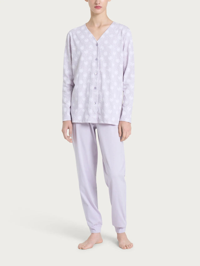 Realizzato in morbido jersey di cotone, questo pigiama aperto presenta un elegante scollo a V e pratici bottoni per facilitare i movimenti. Ideale per un'estate fresca e alla moda.