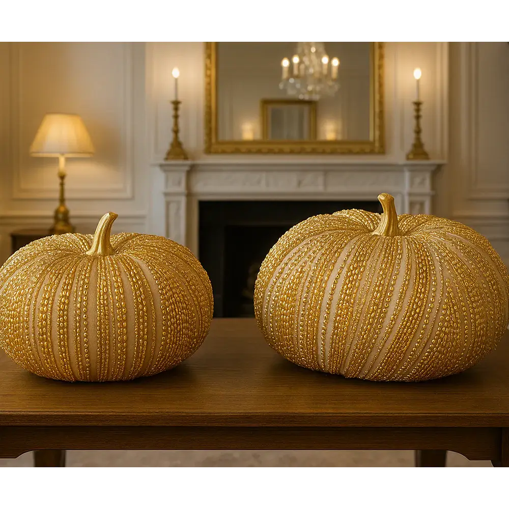 Morbido cuscino a forma di zucca della collezione "Zucche di Sogno" by Blanc Mariclò, impreziosito da perline color oro che catturano la luce, creando un effetto elegante e raffinato.