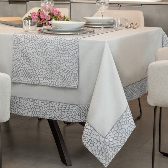 Set tovaglia con runner in panama tinto in filo di puro cotone di alta consistenza su armatura mattè, con bordo in tessuto jacquard disegno geometrico.