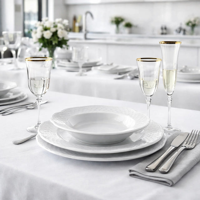 Ideale in uno stile classico ma adatto anche ad una tavola contemporanea e glamour grazie alla candida porcellana bianca, messa in risalto da una pregiata lavorazione lungo i bordi e sul fondo dei piatti