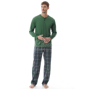 La maglia serafino in tinta unita e il pantalone scozzese creano un mix di comfort e stile unico, ideale per una serata di riposo perfetta.