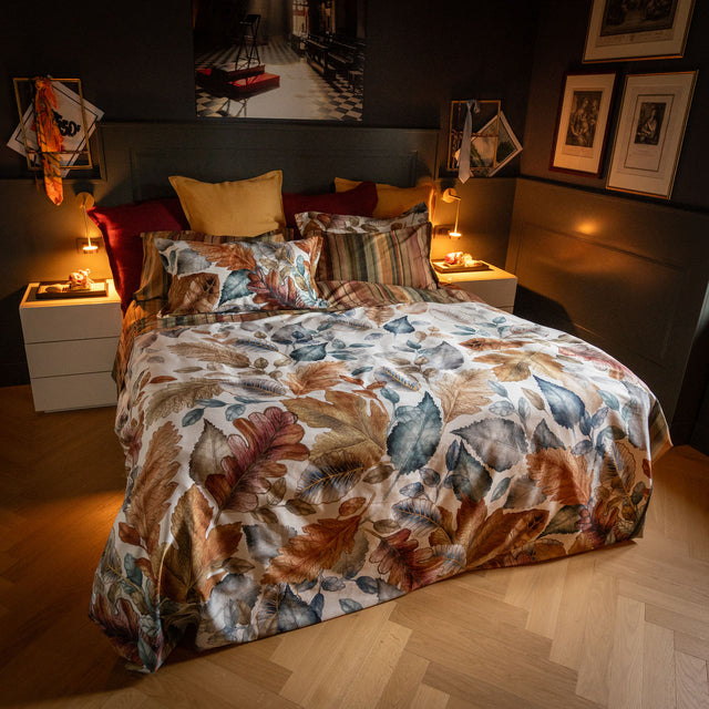 Questo completo lenzuolo stampato con foglie su raso di cotone porterà un tocco di eleganza alla tua camera da letto.