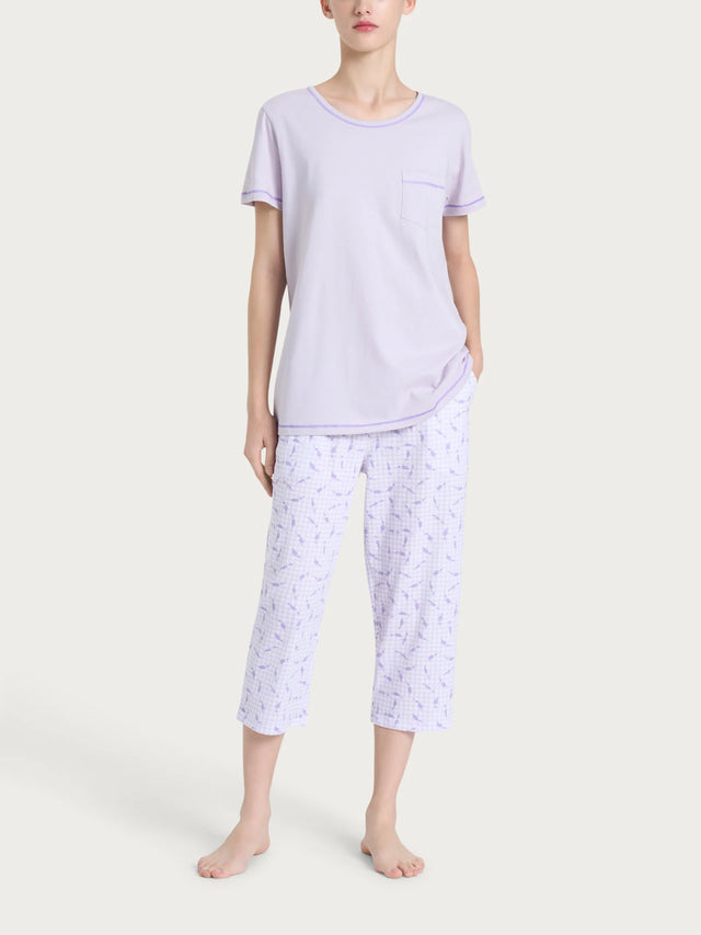Il pantaloncino a pinocchietto presenta una stampa all-over che varia a seconda del colore, conferendo un tocco di stile distintivo e rendendo il pigiama unico e originale.