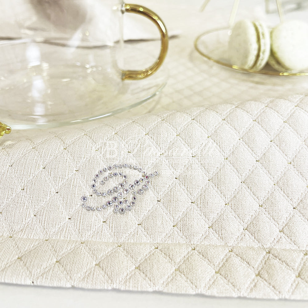 Set di centrini in tessuto piqué jacquard con logo in cristalli.