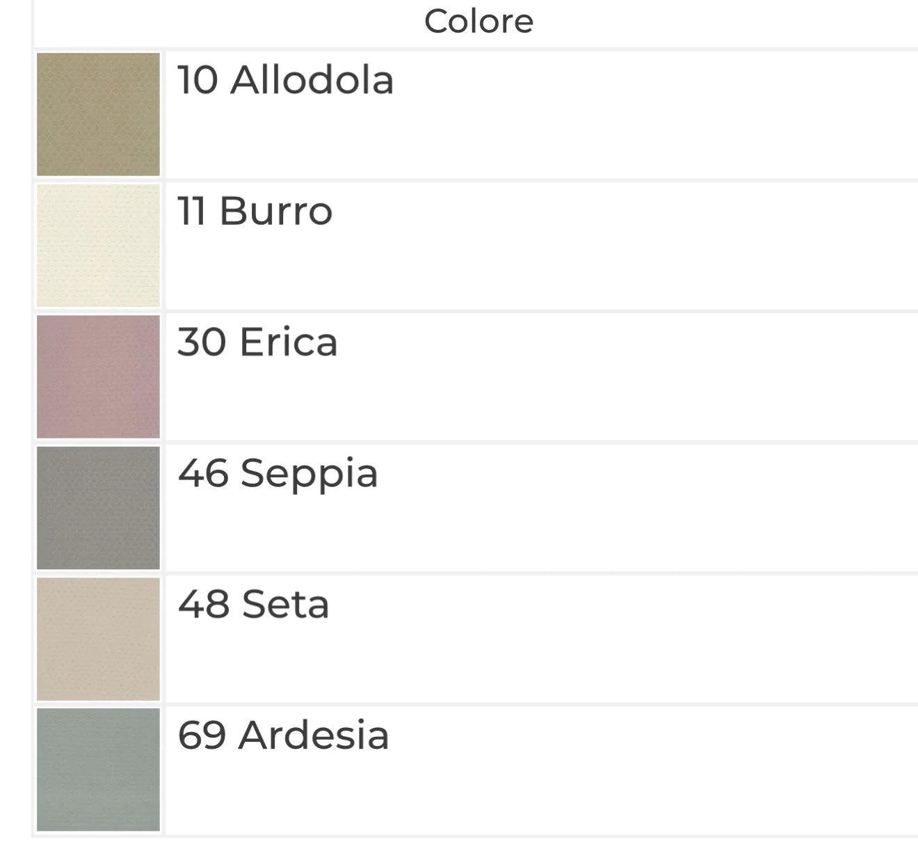 Colori: 10 Allodola - 11 Burro - 30 Erica - 46 Seppia - 48 Seta - 69 Ardesia