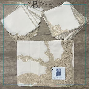 Tessuto 100% puro lino con 12 tovaglioli + 12 da dessert, ricamati ed eleganti, è montata con tecnica punto cordoncino a mano su una tela in ecrù naturale Bellora.