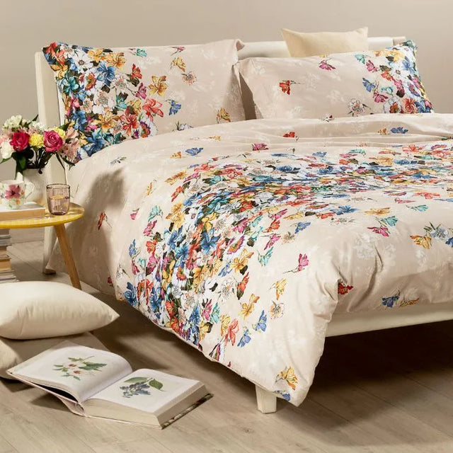 Porta allegria e colori nella tua camera da letto con la parure per copripiumino matrimoniale Caleffi in morbido cotone pettinato e stampa digitale Serra, la fantasia iconica della nuova stagione.