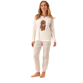 Questo pigiama unisce stile e comfort con un'apertura collo particolare e un adorabile cagnolino in pelliccetta applicato.
