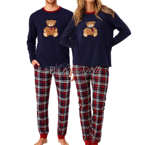 Pigiama unisex in caldo cotone composto da maglia blu con dolce orsetto ricamato e pantalone lungo a quadri scozzesi.
