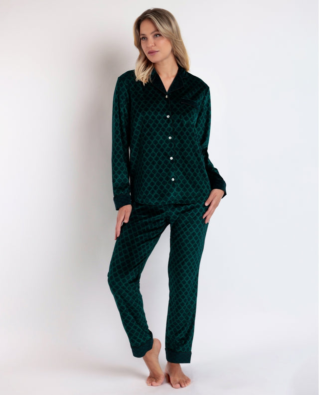 Pigiama aperto, realizzato in speciale tessuto di velluto, con maniche lunghe e pantaloni lunghi.