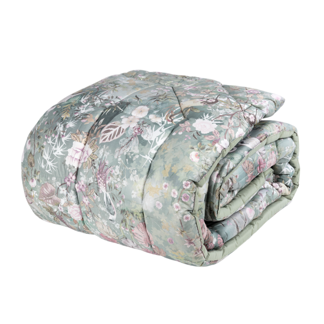 Inspirato al movimento artistico preraffaellita, la trapunta invernale matrimoniale Fazzini Giardini d'Oriente svela un'esplorazione esotica nei tessuti pregiati di fine Ottocento.