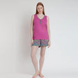 Il top in viola con scollo a serafino e bottoncini ti regala un look pratico e raffinato, mentre i pantaloncini con fantasia multicolore aggiungono un tocco di vivacità.