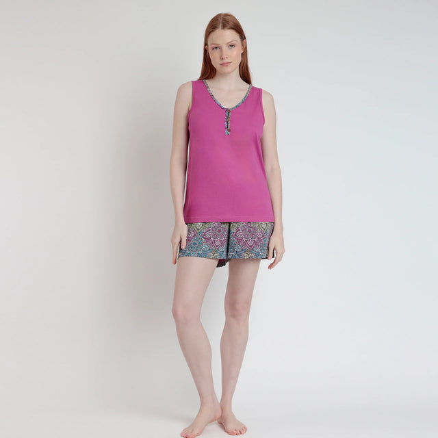 Pigiama in maglia di cotone, senza maniche tinta unita, con scollo abbottonato sul davanti e pantaloncini fantasia.