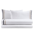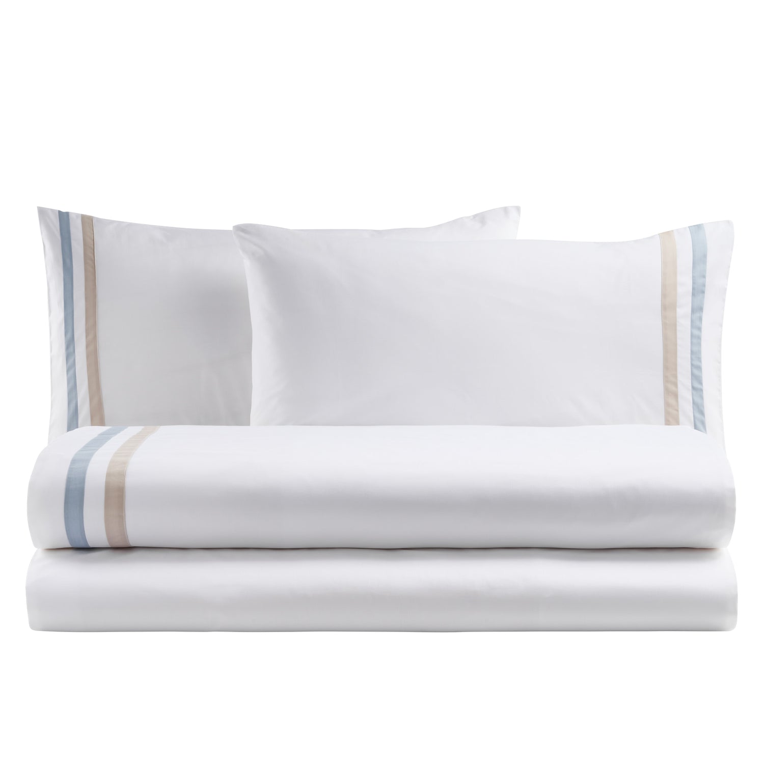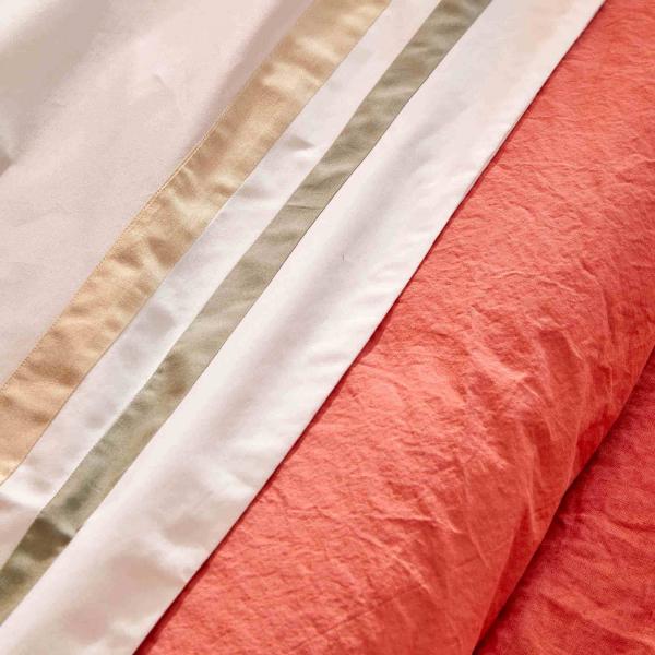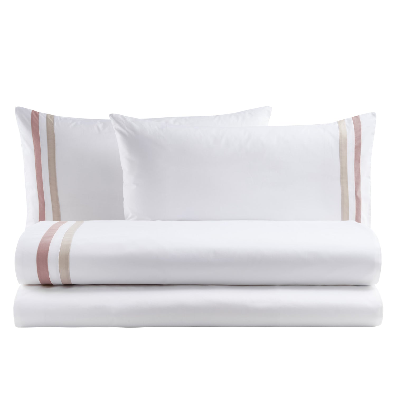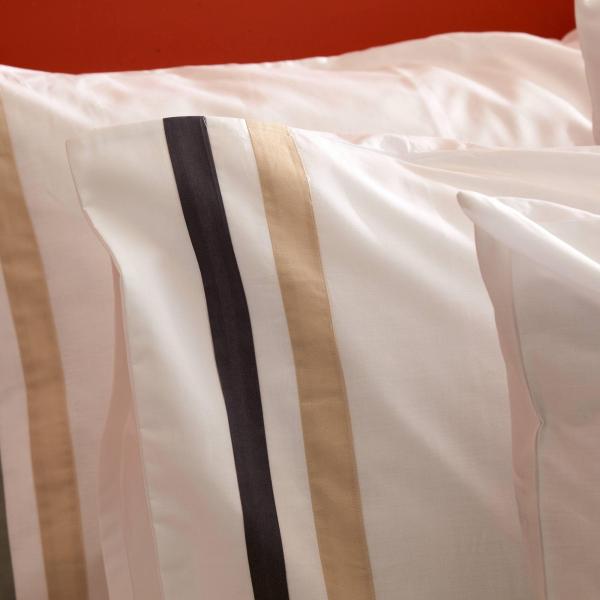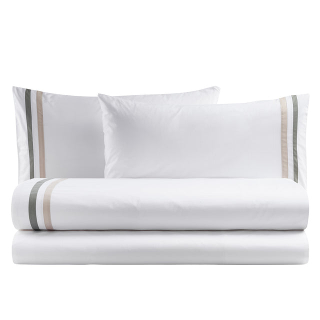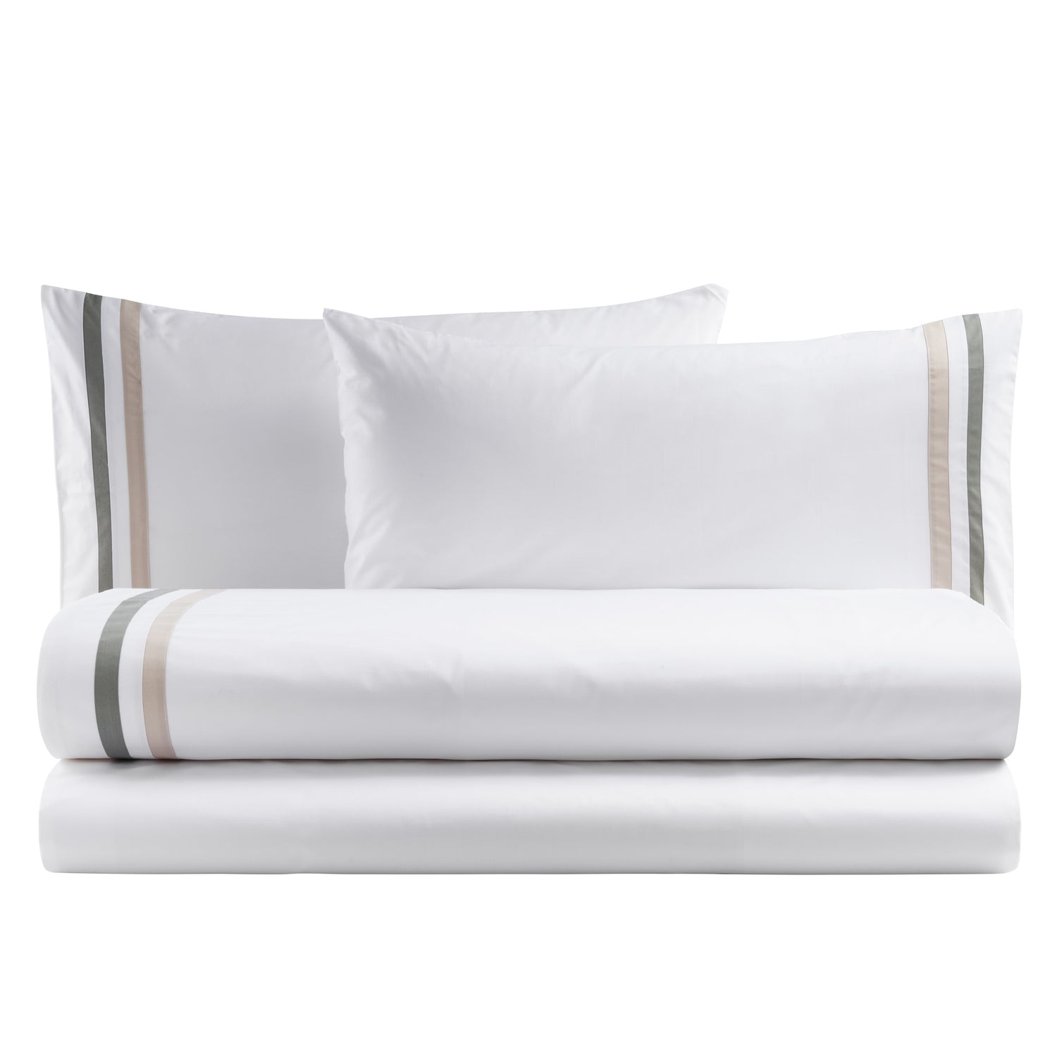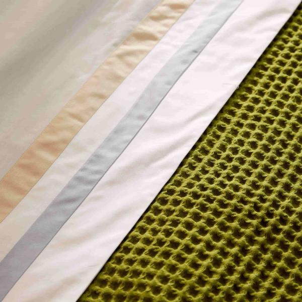 Le federe e il lenzuolo presentano un raffinato gioco di due colori: una tonalità neutra abbinata a una più decisa, creati da balze applicate che conferiscono freschezza e distinzione.