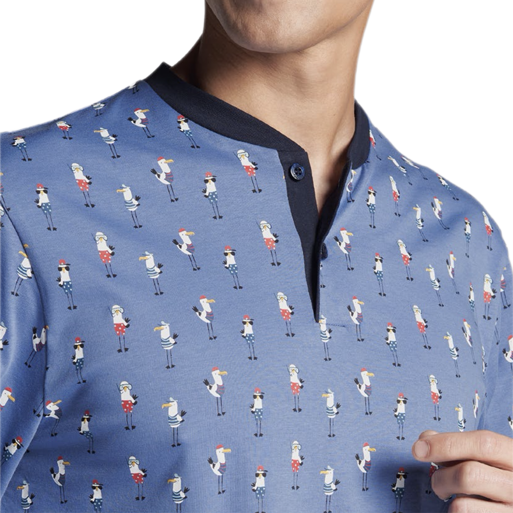 La maglietta con una vivace stampa di gabbiani, è impreziosita da dettagli di colore nel parasudore e nell'apertura del collo, creando un look sofisticato e curato.