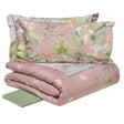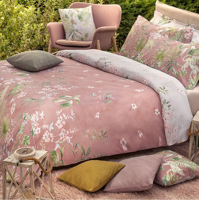 Completo copripiumino realizzato in percalle di cotone 200 T.C. La sacca e le federe a 3 volant sono stampati in digitale con motivi floreali, il sotto con angoli è in tinta unita. Vesti la tua camera da letto con lo stile e la qualità inconfondibile di Tessitura Randi.