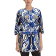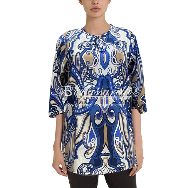 Girocollo con laccetti e maniche 3/4, è impreziosita da fantasie  che la rendono fresca e dallo stile primaverile.