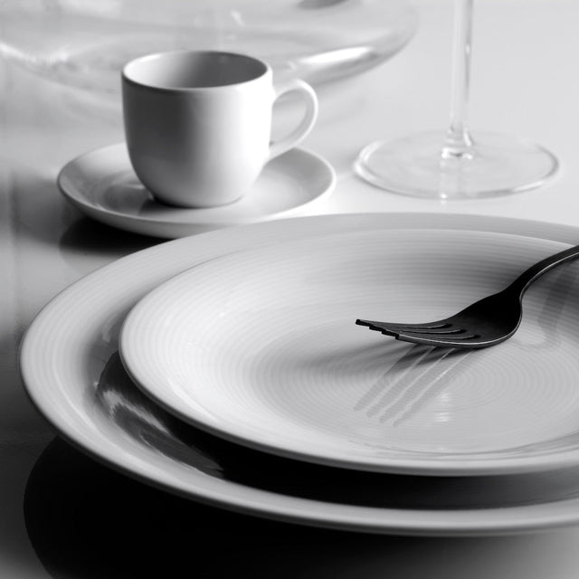 Ideale in uno stile classico ma adatto anche ad una tavola contemporanea e glamour grazie alla candida porcellana bianca, messa in risalto da una pregiata lavorazione lungo i bordi e sul fondo dei piatti