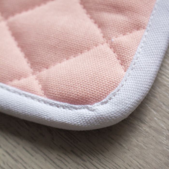 La trapuntatura a rombi, elemento distintivo della collezione India, dona struttura, resistenza e un aspetto curato, mentre il bordo bianco a contrasto incornicia la presina con precisione sartoriale, aggiungendo luminosità al design. Il pratico passante consente di appenderle facilmente, mantenendole sempre a portata di mano e valorizzando l’estetica della cucina.