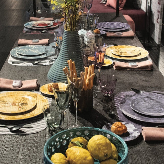 La collezione Wallpaper, disegnata e pensata da Andrea Castrignano per una mise en place piena di colore, si sviluppa in un assortimento di piatti tra cui segna posto, piatti frutta e piattini pane per gli amanti del vero bon ton, declinati in sei gamme di colori e fantasie. La linea, prodotta in Europa, è realizzata in porcellana di altissima qualità ed è cotta a 1160 gradi. La decalcomania del decoro sottosmalto è serigrafata in Italia sulla base dei disegni proposti dallo stesso Castrignano.