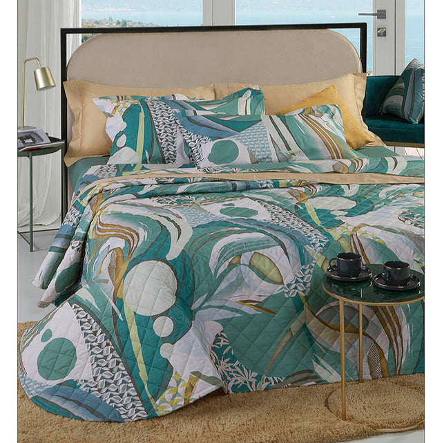 Trapunta leggera realizzata in percalle di cotone 200 T.C. Capo stampato in digitale con motivi geometrici, esaltati dalla trapuntatura a rombi.