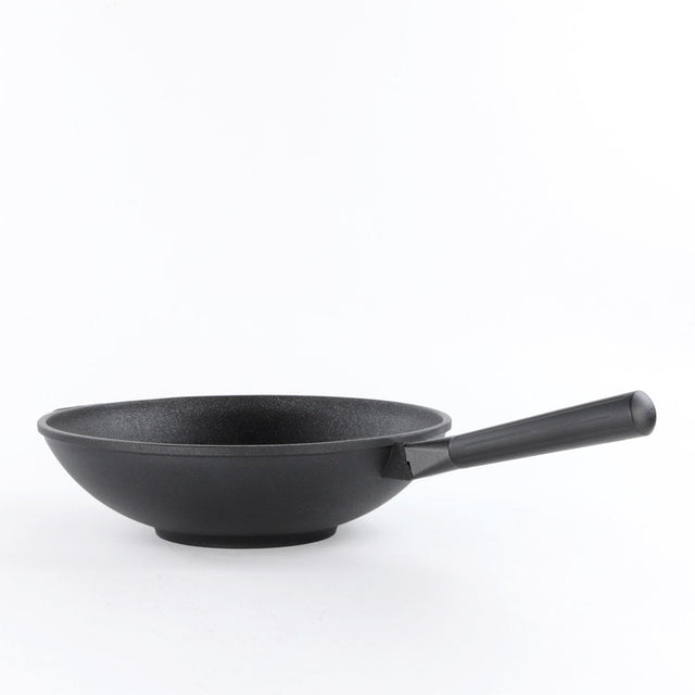 Il manico Konico del wok è realizzato in bachelite, un particolare materiale resistente al calore, ed è comodamente rimovibile dal corpo della padella tramite svitamento: si può così completare la cottura delle pietanze in forno e occupare meno spazio nei mobili della cucina.