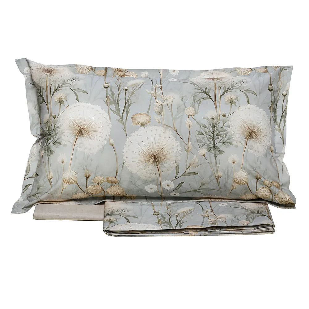 Completo lenzuola con balza a giorno realizzato in percalle di cotone 200 T.C. RICICLATO. Il lenzuolo e le federe a 4 volant sono stampati in digitale con motivi floreale; il sotto con angoli è stampato in tinta unita con un delicato motivo che ricorda la trama del lino. Vesti la tua camera da letto con la nuova collezione sostenibile di Tessitura Randi.