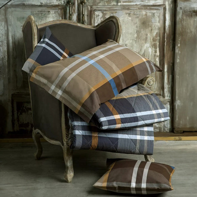 Completo lenzuola scozzesi realizzato in percalle di cotone tinto filo 200 T.C. Il lenzuolo sopra e le federe a 3 volant sono in fantasia scozzese, mentre il lenzuolo sotto con angoli è in tinta unita. Vesti la tua camera da letto con lo stile e la qualità inconfondibile di Tessitura Randi