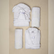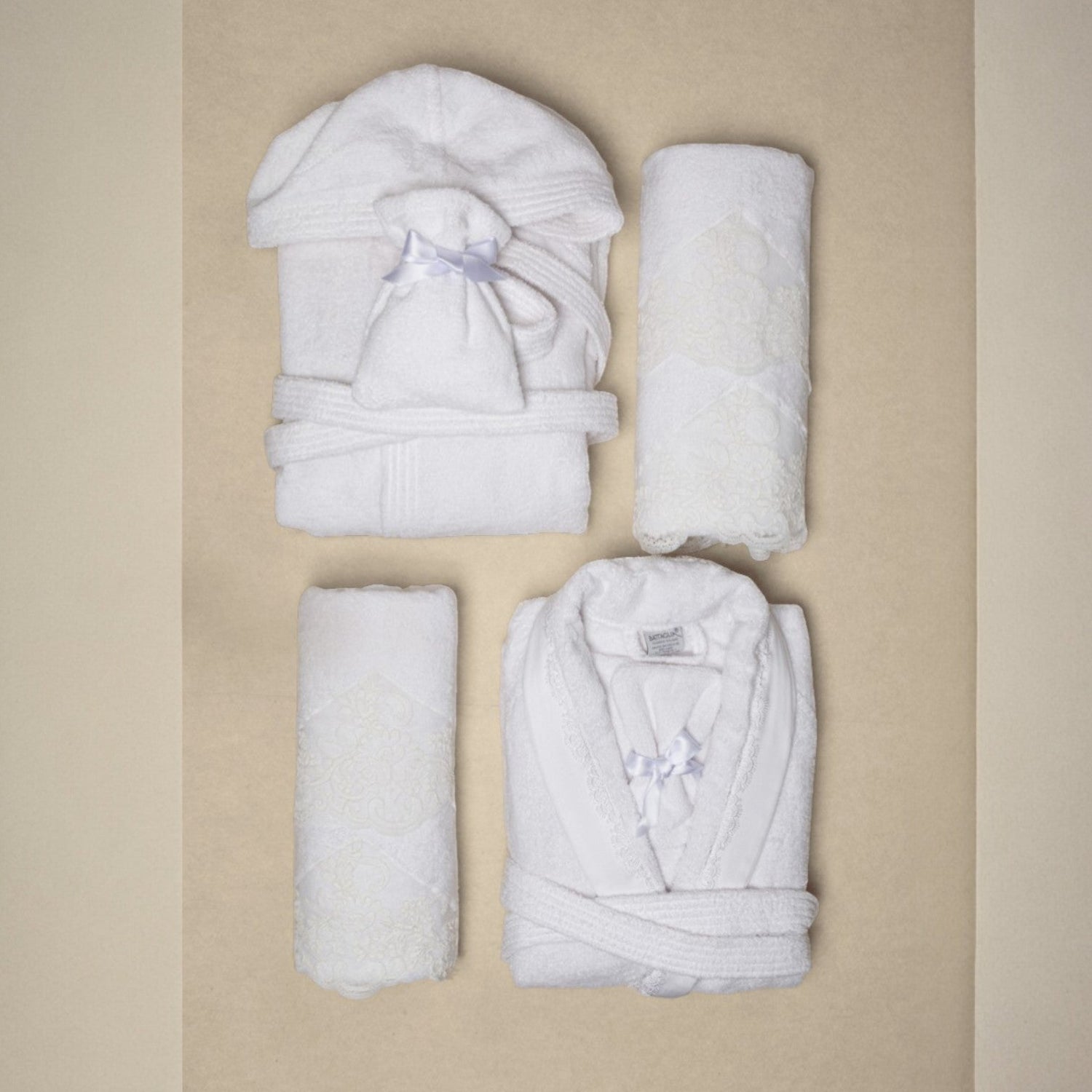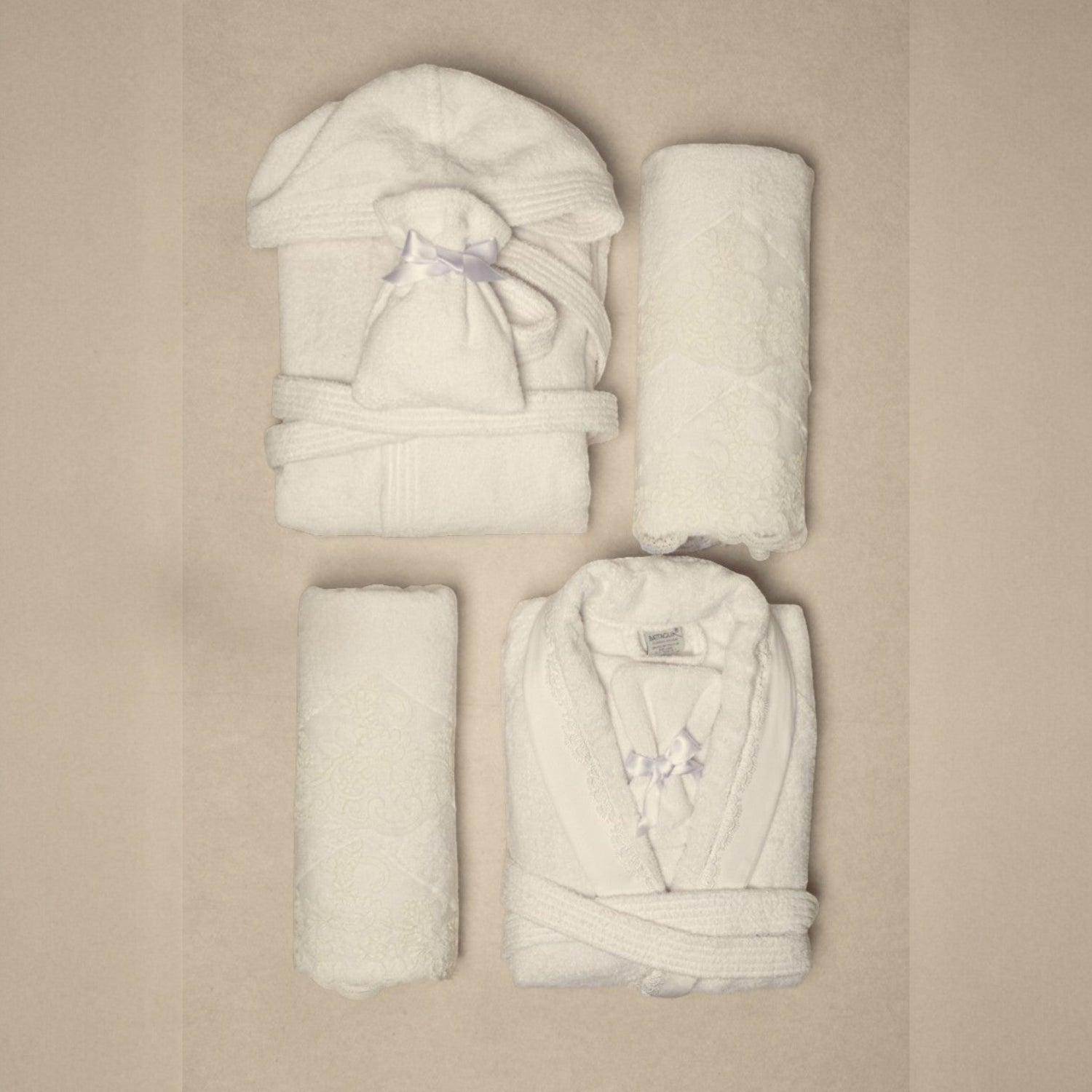 Completo da bagno per 2 persone in spugna di cotone con applicazione in pizzo rebrodè. Composto da 2 accappatoi (di cui 1 con cappuccio), 2 asciugamani viso, 2 asciugamani ospite, 1 sacchetto per sali da bagno, 1 guanto per scrub.