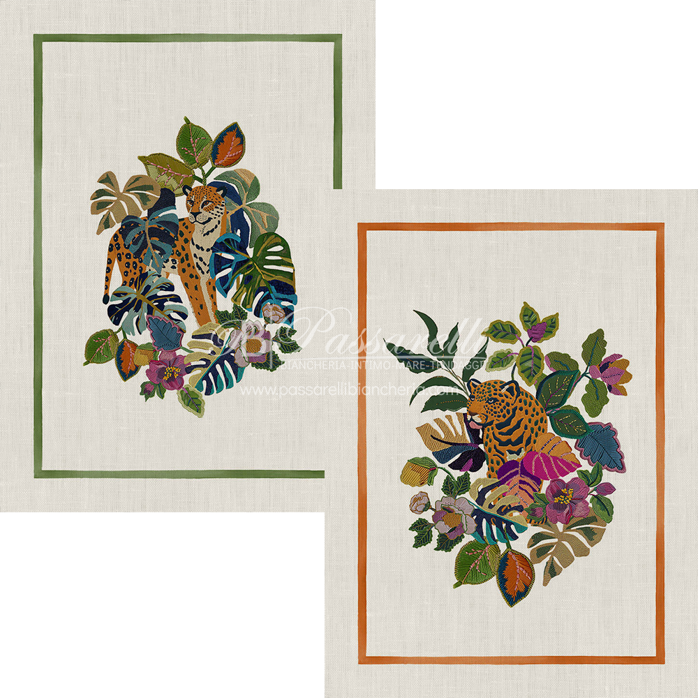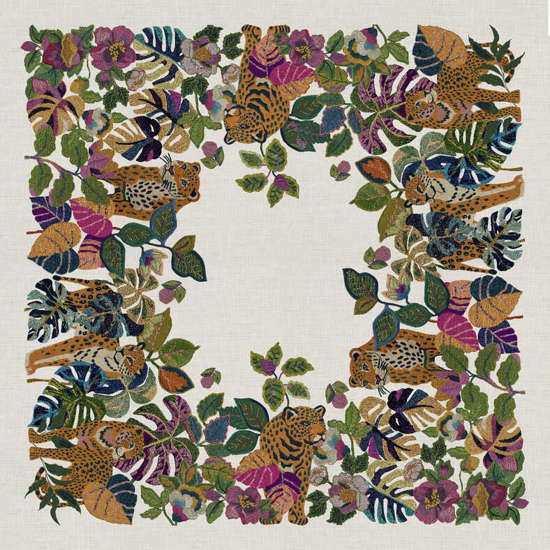 La tovaglia a tema giungla LEOLEAF trasforma la tavola in una scenografia esotica di forte impatto visivo. Le grandi foglie tropicali e i felini dallo sguardo fiero costruiscono una narrazione decorativa intensa, ricca di profondità cromatica e dettagli raffinati.