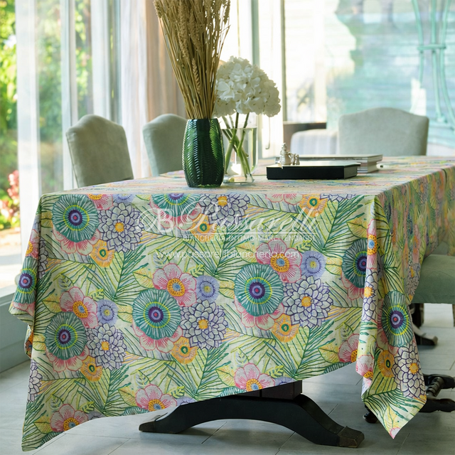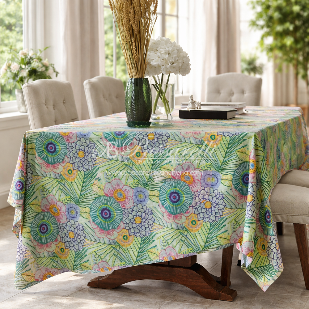 Il design combina grandi fiori stilizzati nei toni del rosa, lilla, azzurro e giallo senape, armoniosamente intrecciati a foglie verde salvia e verde bosco su fondo chiaro naturale.