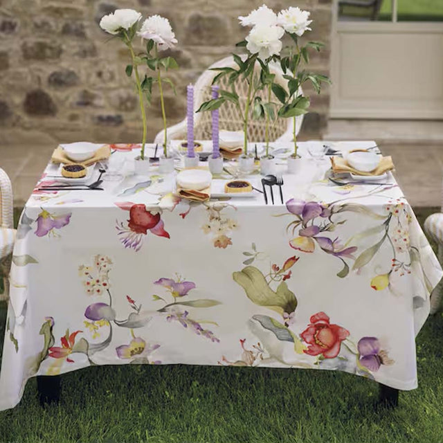 Tovaglia rettangolare in puro Cotone, caratterizzata da un’eleganza naturale e da un design botanico di forte impatto visivo.