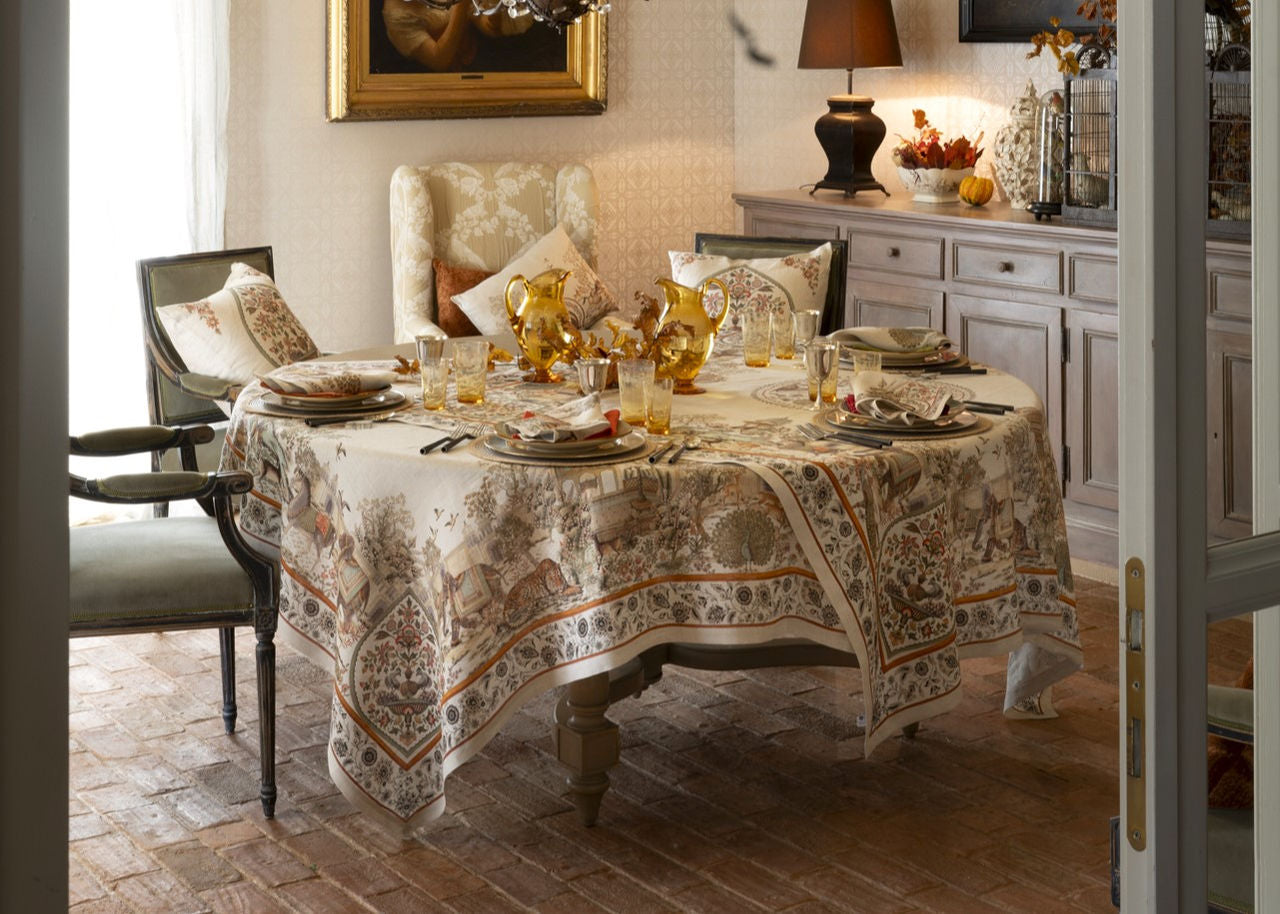 Il lino, noto per la sua resistenza, traspirabilità e durabilità, conferisce alla tovaglia una caduta morbida ma strutturata, perfetta sia per mise en place eleganti sia per ambientazioni outdoor di charme.