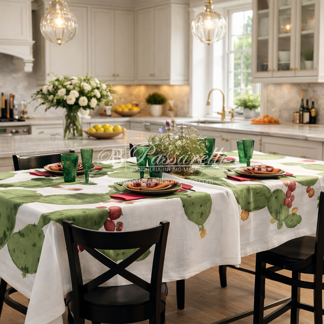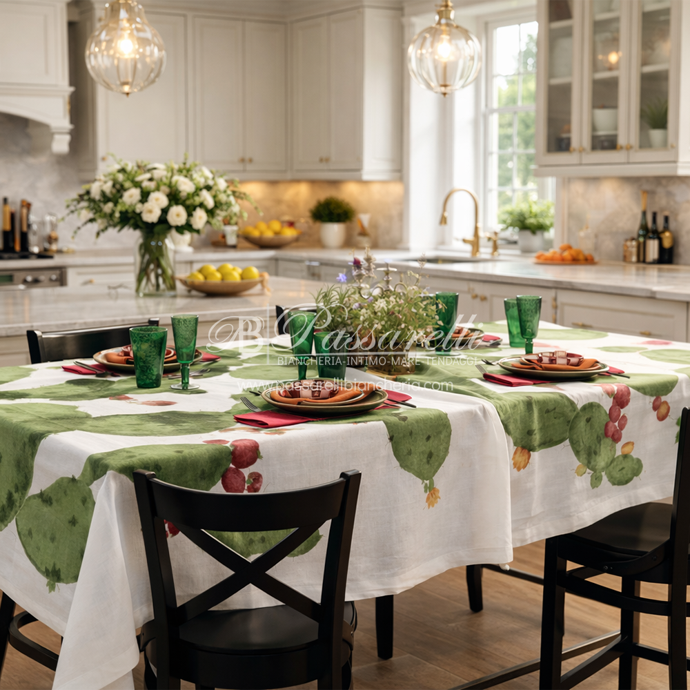 Il lino, noto per la sua resistenza, traspirabilità e durabilità, conferisce alla tovaglia una caduta morbida ma strutturata, perfetta sia per mise en place eleganti sia per ambientazioni outdoor di charme.