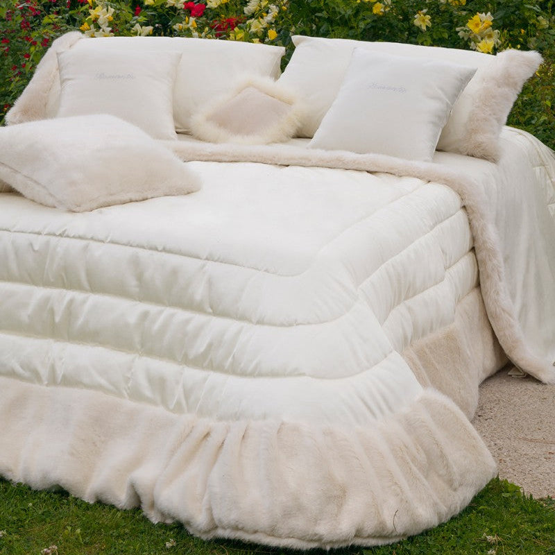 Trapunta in rasone con bordo di pelliccia ecologica disegno piazzato esclusivo con n. 12 perle applicate artigianalmente sul piano letto. Include 2 cuscini.